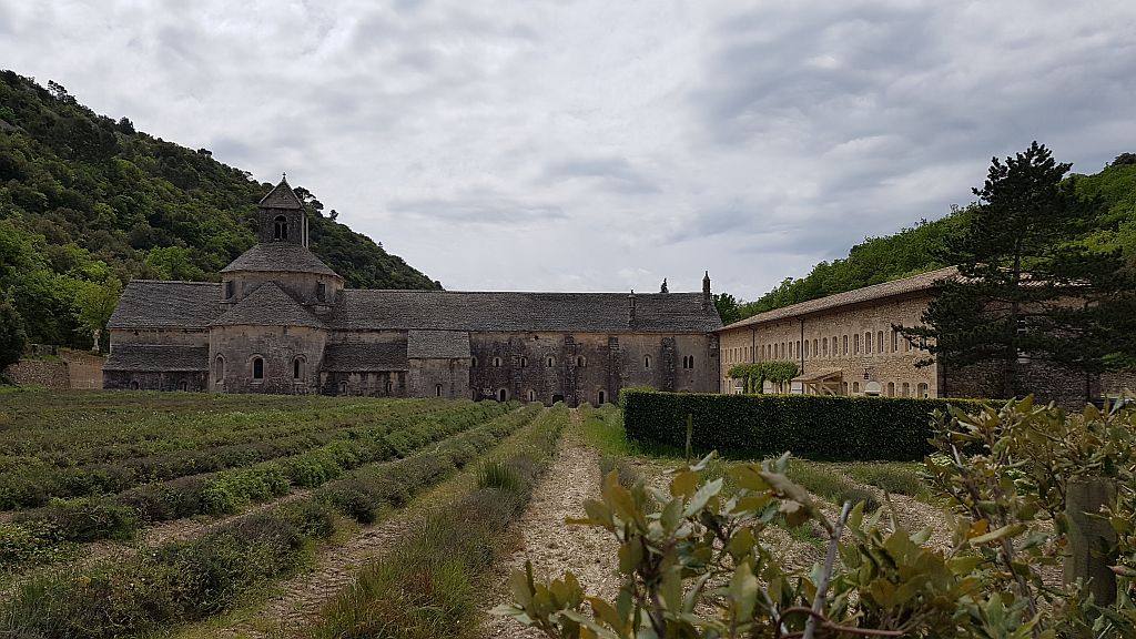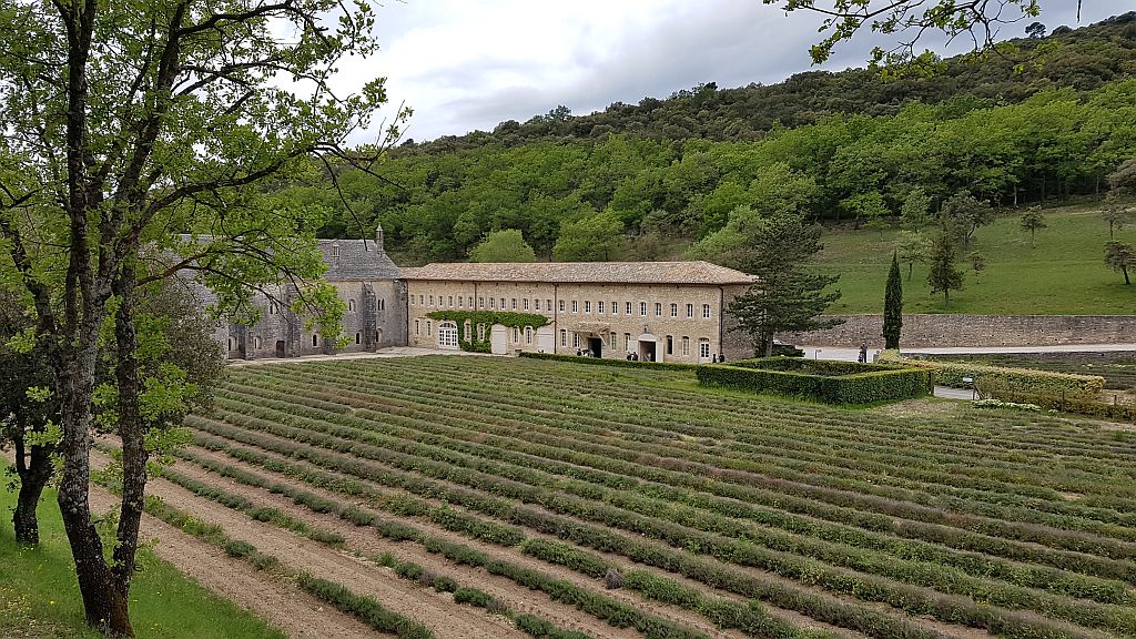 Poglej ostaloPo nekaj krajših postankih smo prišli do konca kanjona v Abbaye de Senaque. Tu je samostan med polji sivke. Sivka žal še ne cveti, tako da je bil bolj pust razgled. Da bi šli na ogled samostan, pa bi morali čakati več kot uro, tako smo se samo malce sprehodili naokoli in pot nadaljevali proti »vodnemu« mestecu.