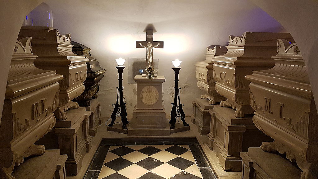 Bourbonska grobnica se nahaja v cerkveni kripti, do katere pripelje ozek in nizek hodnik, ki ima ob straneh nekaj manjših prostorov in niš, namenjenih za pokope, ki pa so prazne, z izjemo zadnjega, v kateri leži sarkofag Petra de Blacas d’Aulpsa. V kripti se nahaja šest sarkofagov, trije na levi in trije na desni strani, ki so iz 19. stoletja. Pet izmed njih je kamnitih, eden pa je bronast. Kamniti na čelni strani vsebujejo začetnici imen pokopanega. Na zidovih za sarkofagi je vzidanih 6 kamnitih napisnih plošč z imeni.
