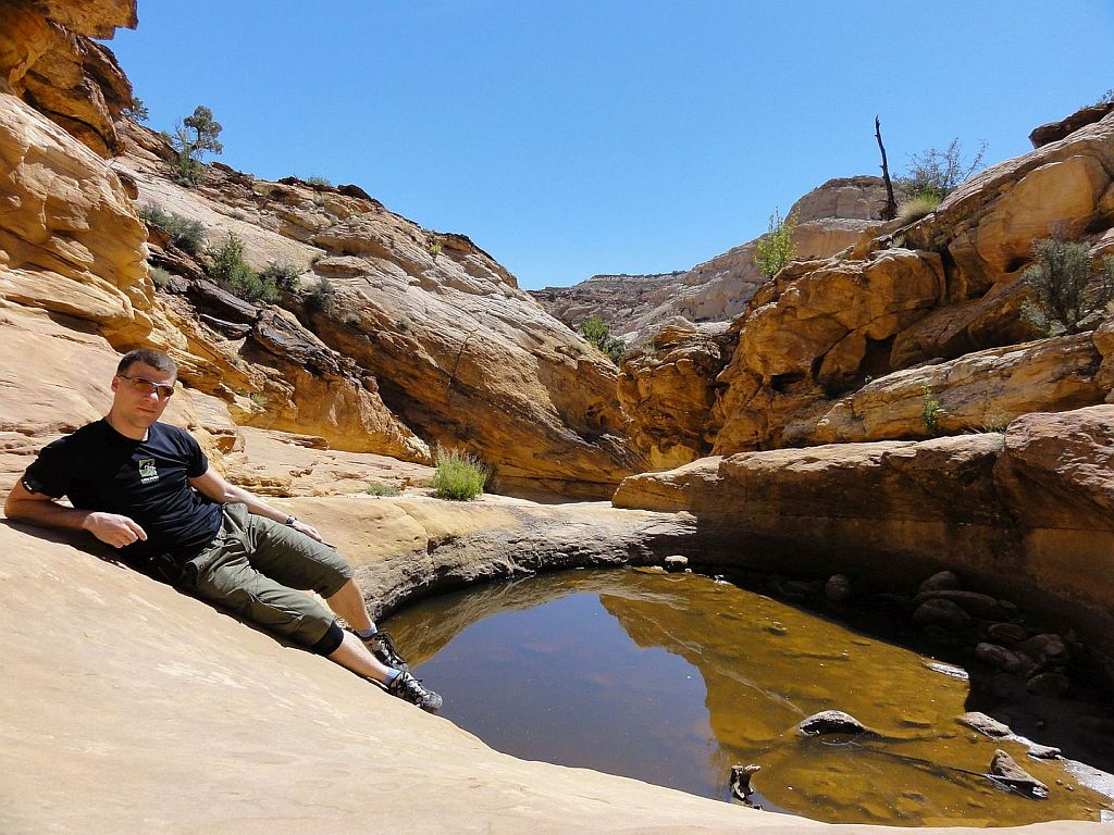 Zjutraj sva si najprej ogledala Capitol Gorge Passage. Spustila sva se po soteski do njenega najožjega dela – Petroglyph narrows. V tem času seveda vode ni bilo, tako da sva brez problema hodila po strugi. Na koncu se je Dejan spravil še v višave, da je poslikal nekaj vodnih “tankov”.