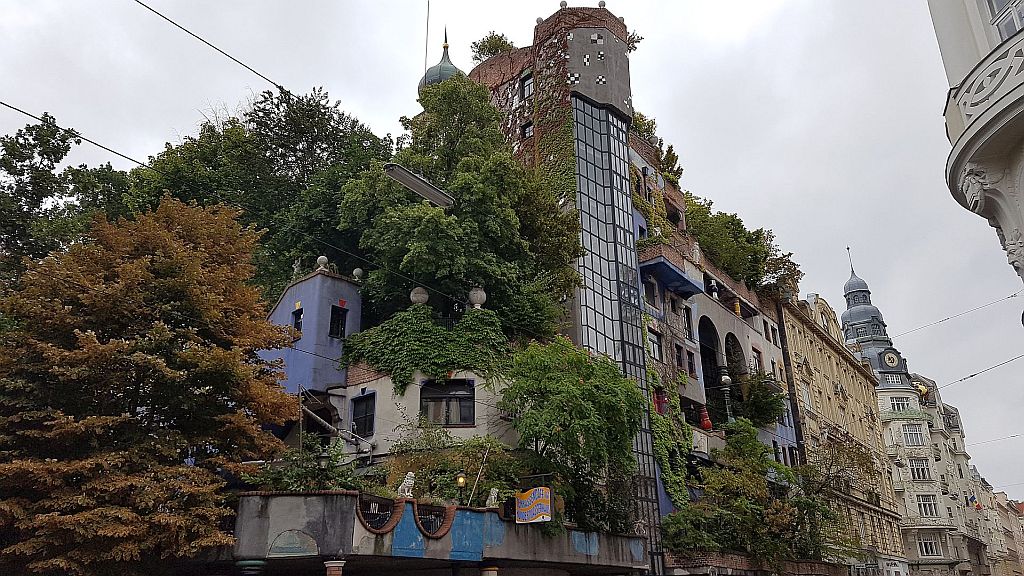 Ko sem se bližal Dunaju, je vreme postajalo deževno. K sreči pa se je dež do samega prihoda na Dunaj umiril. Mimogrede sem še poslikal eno od umetnij Friedensreich Regentag Dunkelbunt Hundertwasserja.