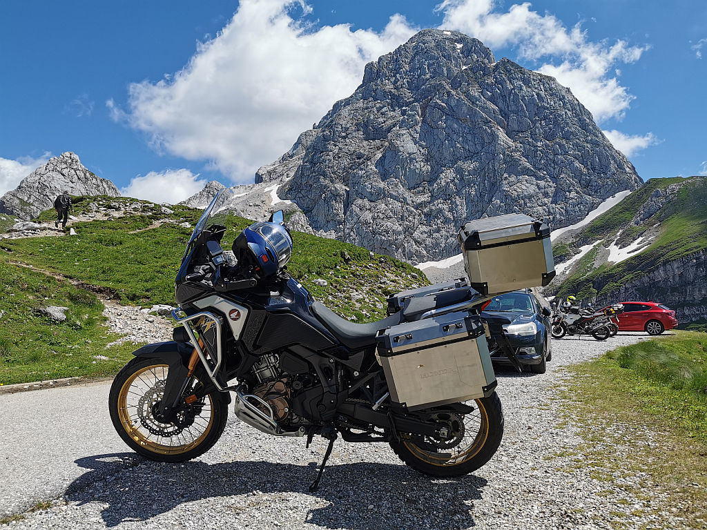 Že nekaj časa je minilo, od kar sem se zapeljal čez Vršič. Danes je ravno pravšnji dan, da se zapeljem do Mangartskega sedla. Hop in že sem bil v sedlu moje nove zverinice. Do Kranjske gore sva kar hitro privijugala. Pri Jasni je seveda obvezen kratek postanek in obisk kozoroga. Nekaj kilometrov naprej pa seveda postanek pri Ruski kapelici. Obiskovalcev je bilo malo. Pot na Vršič je bila še kar mirna. Je pa na prelazu bila kar velika gneča. Očitno se splača Vršič obiskati med tednom in ne čez vikend, tako kot jaz sedaj. K sreči je bila potem pot na Mangartsko sedlo skoraj prazna.