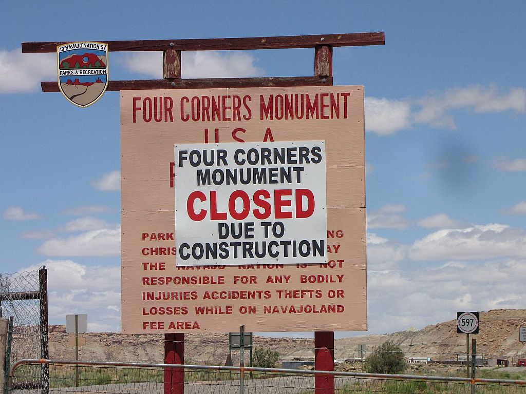 Pot do Monument Valley je bil kar dolga, zlasti ker sva si jo še podaljšala, ker sva si ogledala še Four corners. No, ja vsaj mislila sva si, da si jih bova. Banda ameriška kar naprej nekaj dela, tako da je bil dostop do štirih kotičkov seveda zaprt. Lep dolgočasen ovinek po cestah, kjer je ovinek na vsakih nekaj milj.