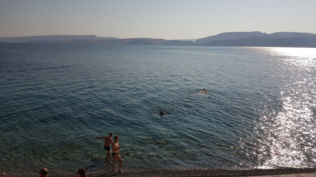 Z Nives, katera je štartala že dan prej, smo se dogovorili, da nam pride nasproti in se dobimo v Karlobagu pri Baški Burji. Ko smo prišli do Burje, nas je že čakala. Tukaj se je pokorajžil še preostanek ekipe in zaplaval v morju. Po osvežitvi smo v dirkaškem stilu odbrzeli proti Paklenici, oziroma Selinam, kjer smo imeli prenočišče.