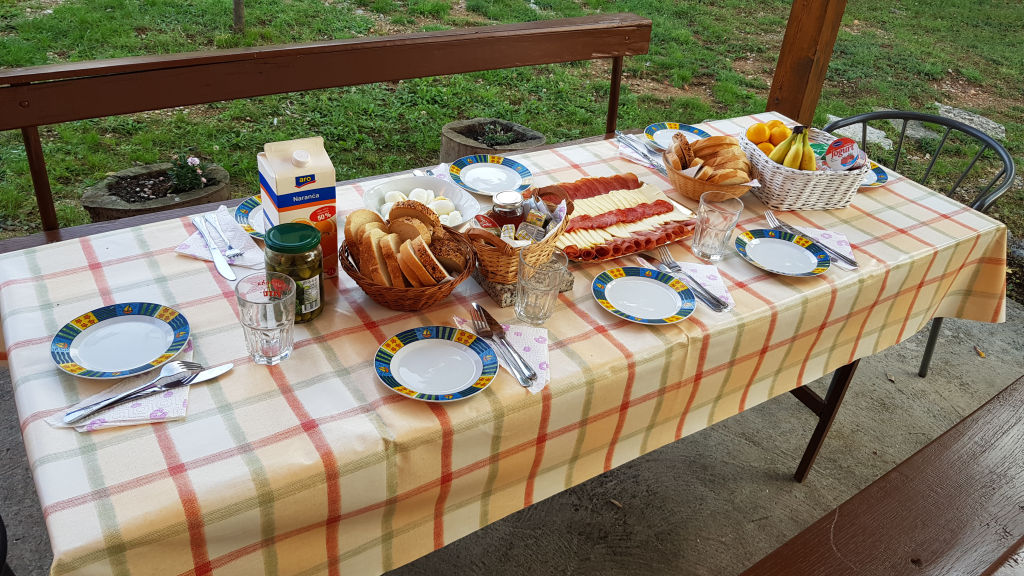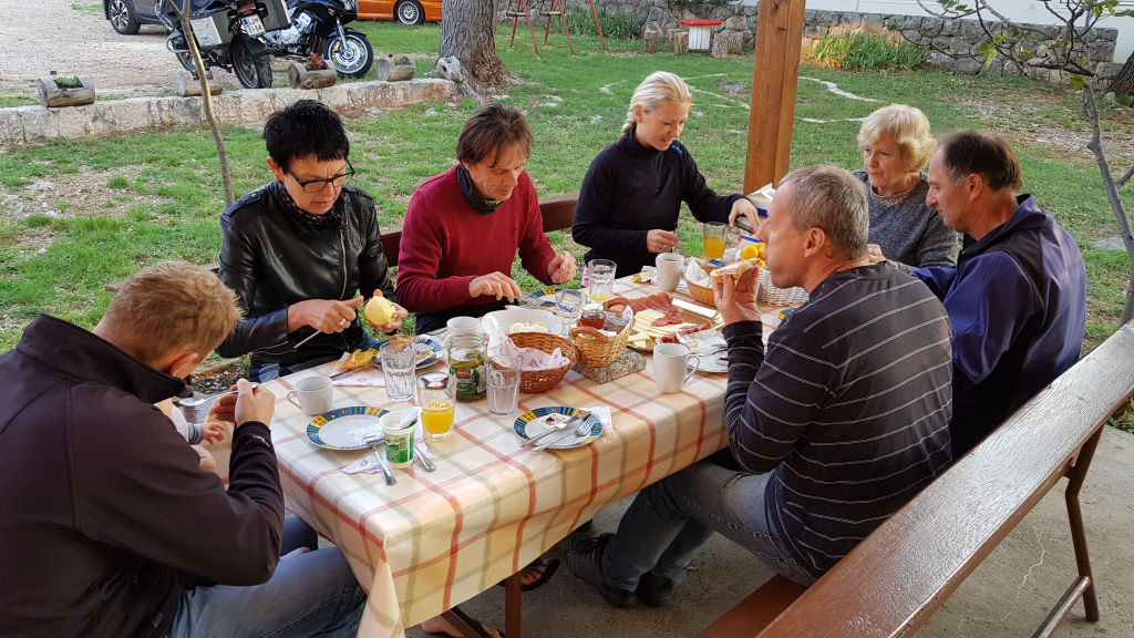 Zjutraj nas je pričakal res obilen in odličen zajtrk. Polnih želodčkov smo se po električnem popravilu Aleševa strojčka odpravili na različne konce. Aleš in njegovi so šli v Biograd na obisk tete Aleševe mame. Njim sta se pridružila še Nives in Grega. Vmes so se ustavili še na razgledni točki na Kamenjaku nad vranskim jezerom. Nazaj so šli skupaj skoraj do Rijeke. Tu so Štefančičevi šli proti Kostelu, Grega in Nives pa proti Brezovici in domov.