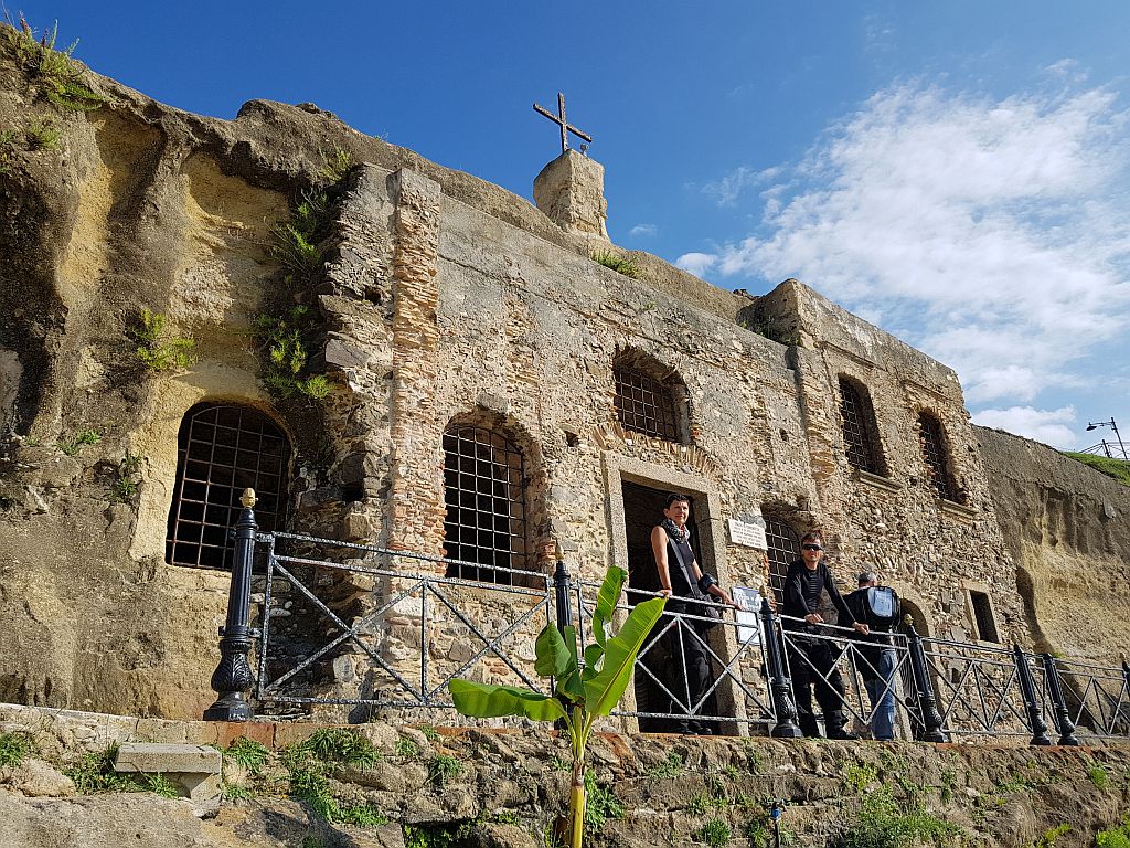 Poglej ostaloTudi danes smo lezli v hribovite kraje. Prvi kraj je bil Gerace. Ogledali smo si Normansko katedralo in ruševine gradu. Pot do tja je potekala ves čas ob obali. Privoščili smo si pijačo in nadaljevali pot v Pizzo. Tokrat smo šli skozi gorski prelaz. Vreme nas je malce strašilo, a smo suhi prispeli do cilja. Je pa zato precej pihalo. Tu smo se sprehodili po starem delu mesta in si privoščili pozno kosilce. Tokrat sem si izbral pico s fižolom in rukolo. Kar okusno. V tem kraju smo si ogledali še cerkvico vklesano v skalo. Lepo urejena notranjost. Potem pa samo še do prenočišča v bližini Paole. Tokrat kar po hitri cesti, da smo čim preje prišli do zasluženega počitka.