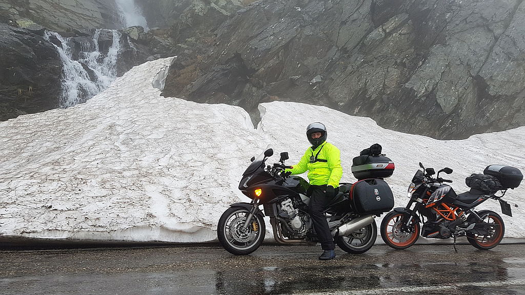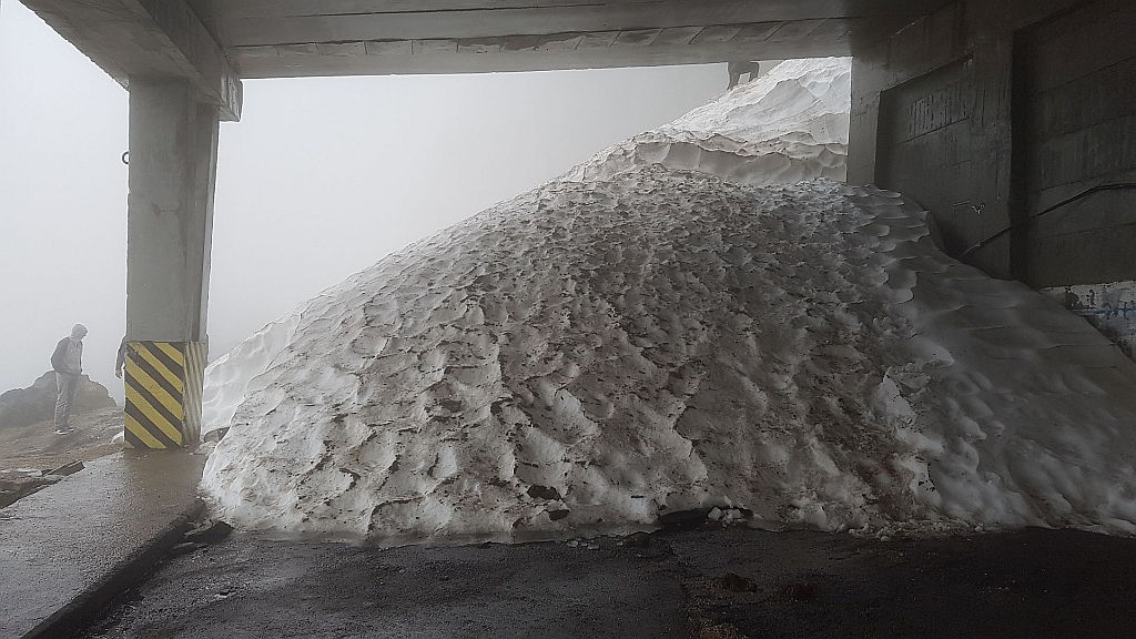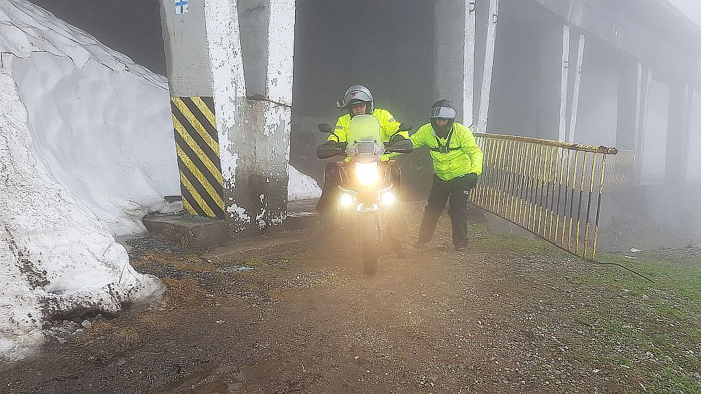 Nas pa je zato pri vrhu čakalo nekaj novih presenečenj. Prvo presenečenje je bila dokaj gosta megla pri vrhu prelaza. Z meglo se je pojavil tudi sneg. Tudi na cesti.
