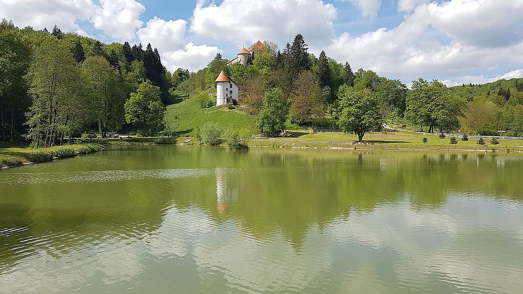 Ker je pri Mokronogu cesta zaprta, me je obvoz pripeljal do Mirne. Tu sem mimogrede opazil zanimivo jezerce in v bližini Grad Mirna. Videti je, da se nekaj obnavlja, a je bil v času mojega obiska zaprt.